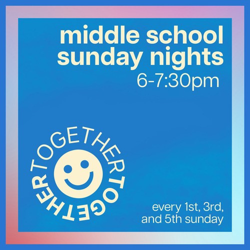 Middle School students will meet on the 1st, 3rd and 5th Sunday of every month from 6:00 to 7:30 PM in the Next Gen Hallway (near the entrance to the Kids Wing).